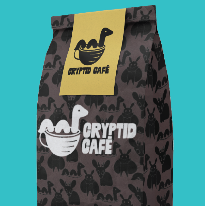 Cryptid Café is a conceptual coffee shop and line of products including coffee and coffee beans, desserts, and more. This project was inspired by a generated prompt of a combination of two contrasting topics, cryptids and coffee, which presented the challenge of finding a way to create a cohesive brand incorporating these topics.